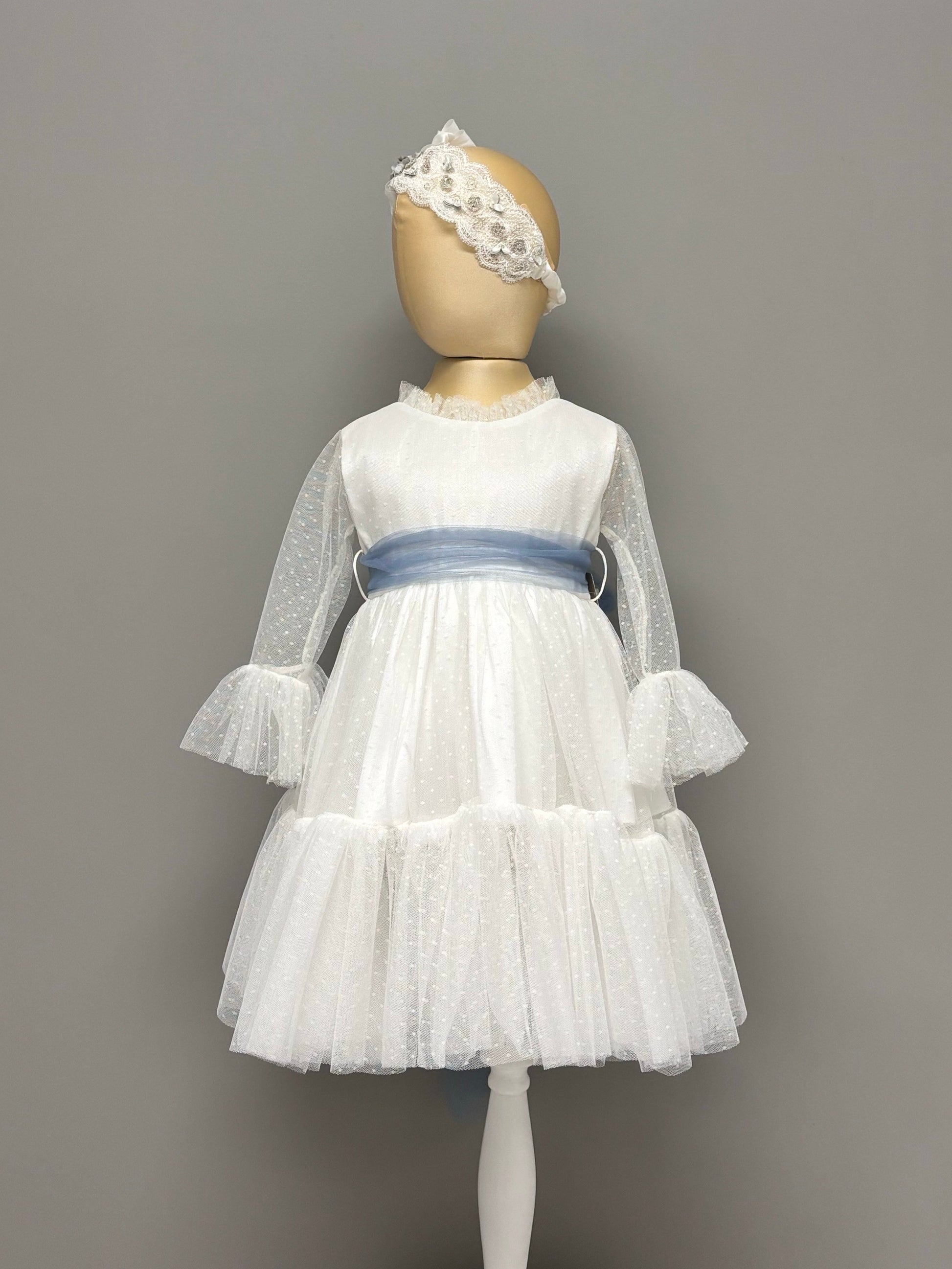 Vestido estilo español confeccionado en tul con detalles de lunares texturizados. La manga es tres cuartos, con olanes y cuello.