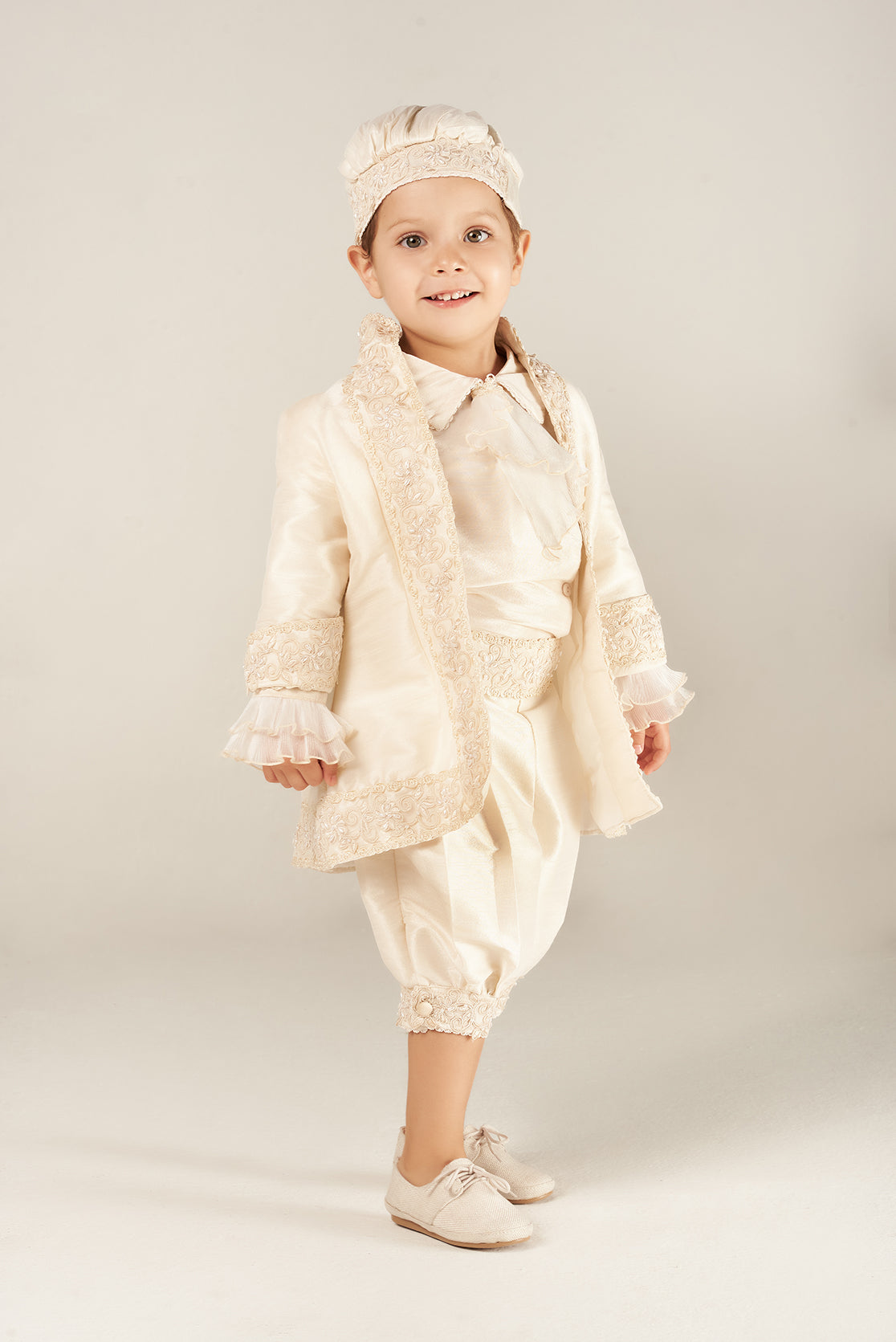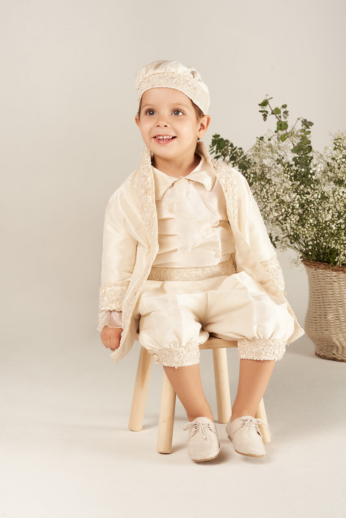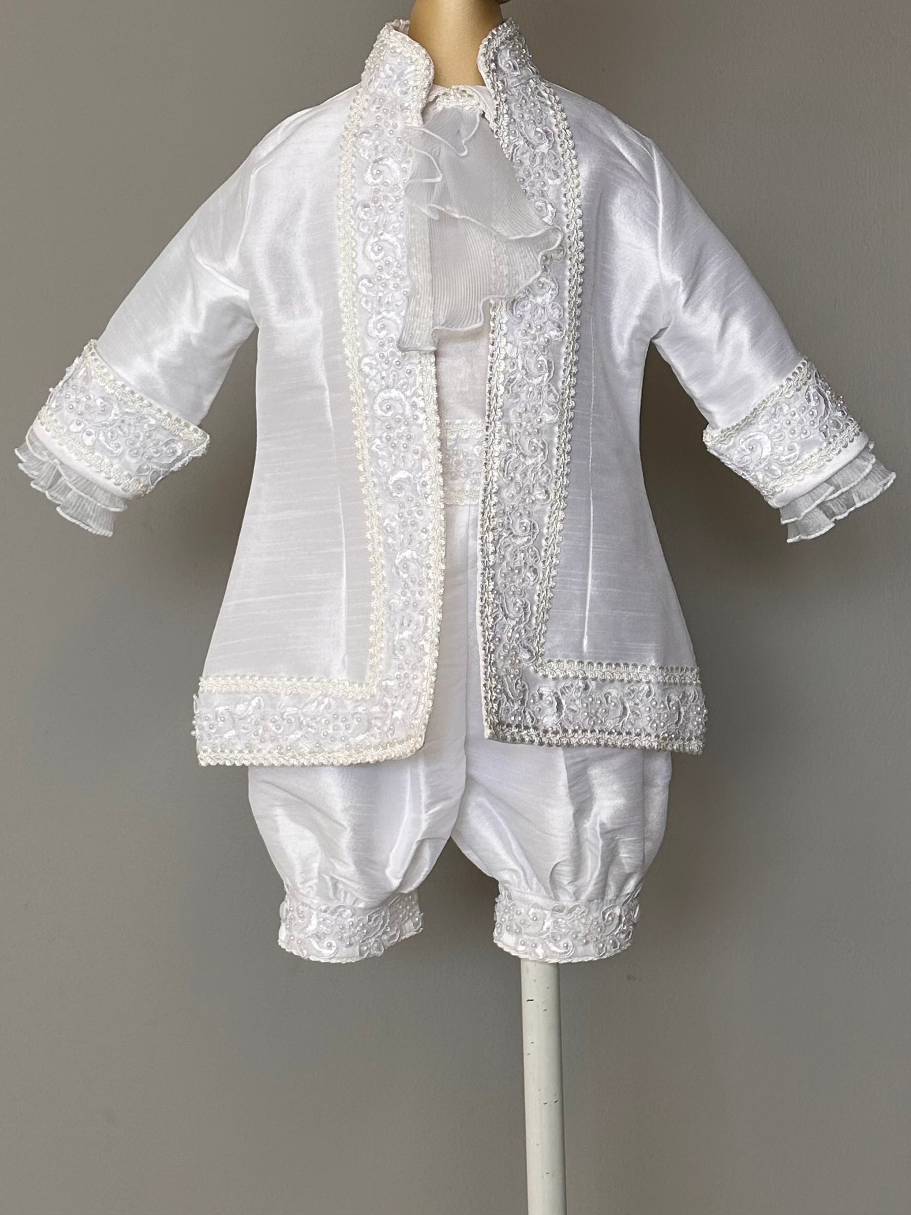 Exclusivo traje de bautizo para niño, confeccionado artesanalmente, con una fina tira de encaje. Incluye camisa, short, saco y gorro.