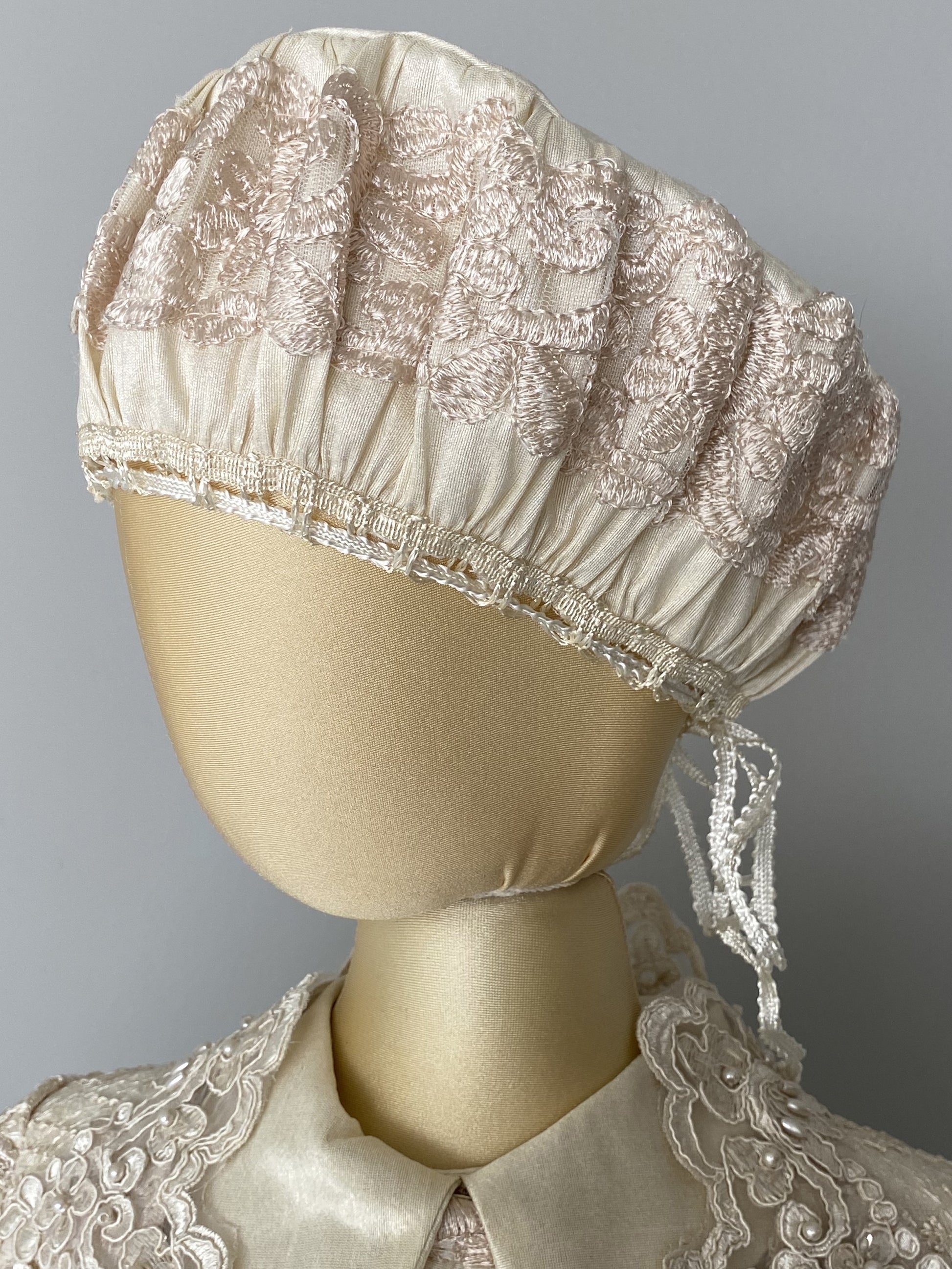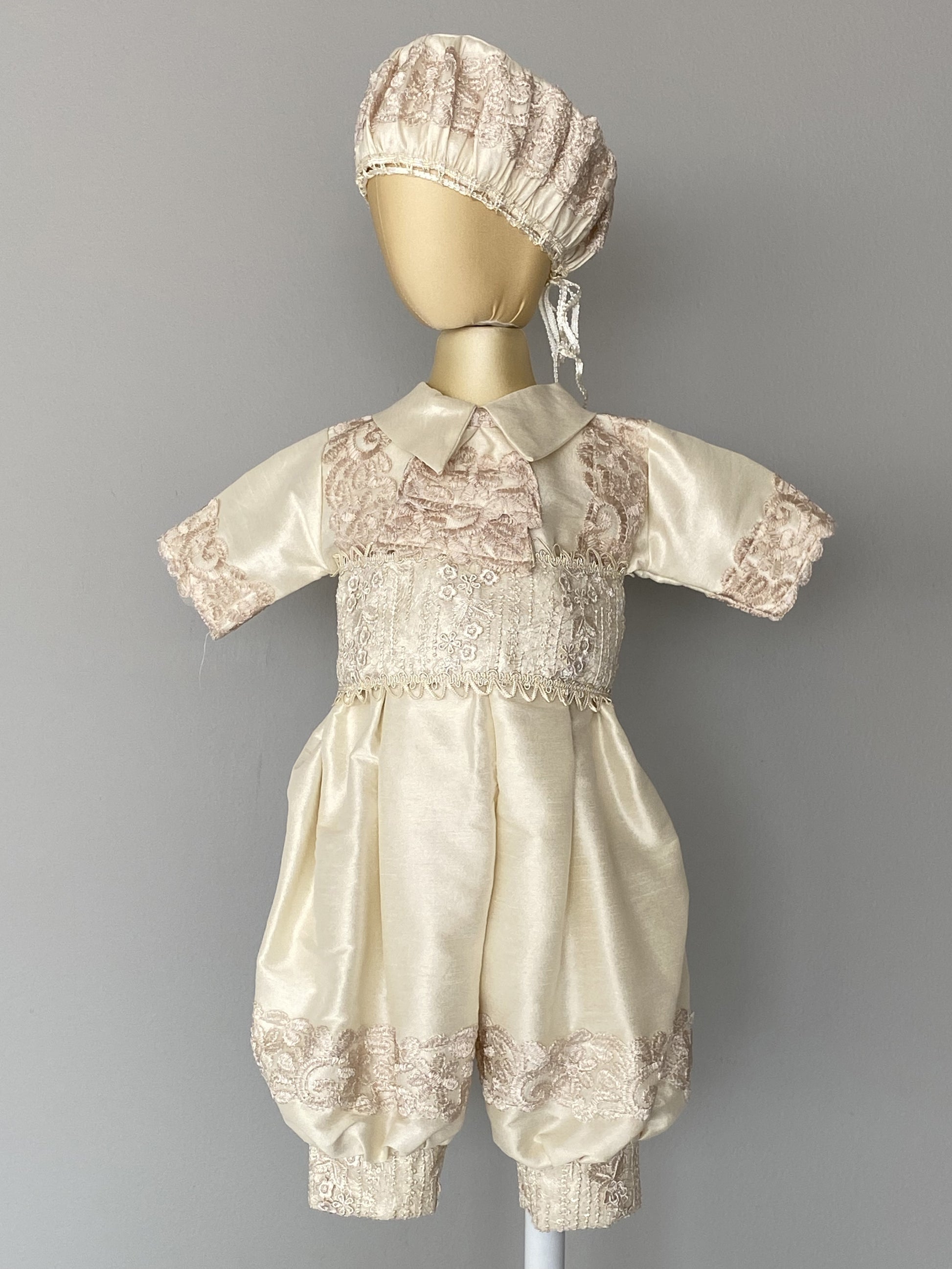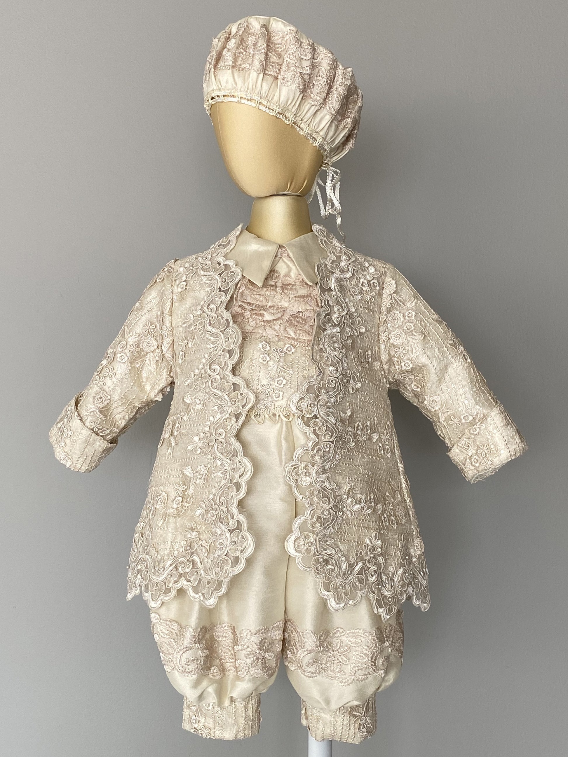Traje de niño exclusivo de bautizo confeccionado artesanalmente con encaje con finos detalles en encaje color beige y acra. Juego de 4 piezas que incluyen camisa, short, saco y gorro.