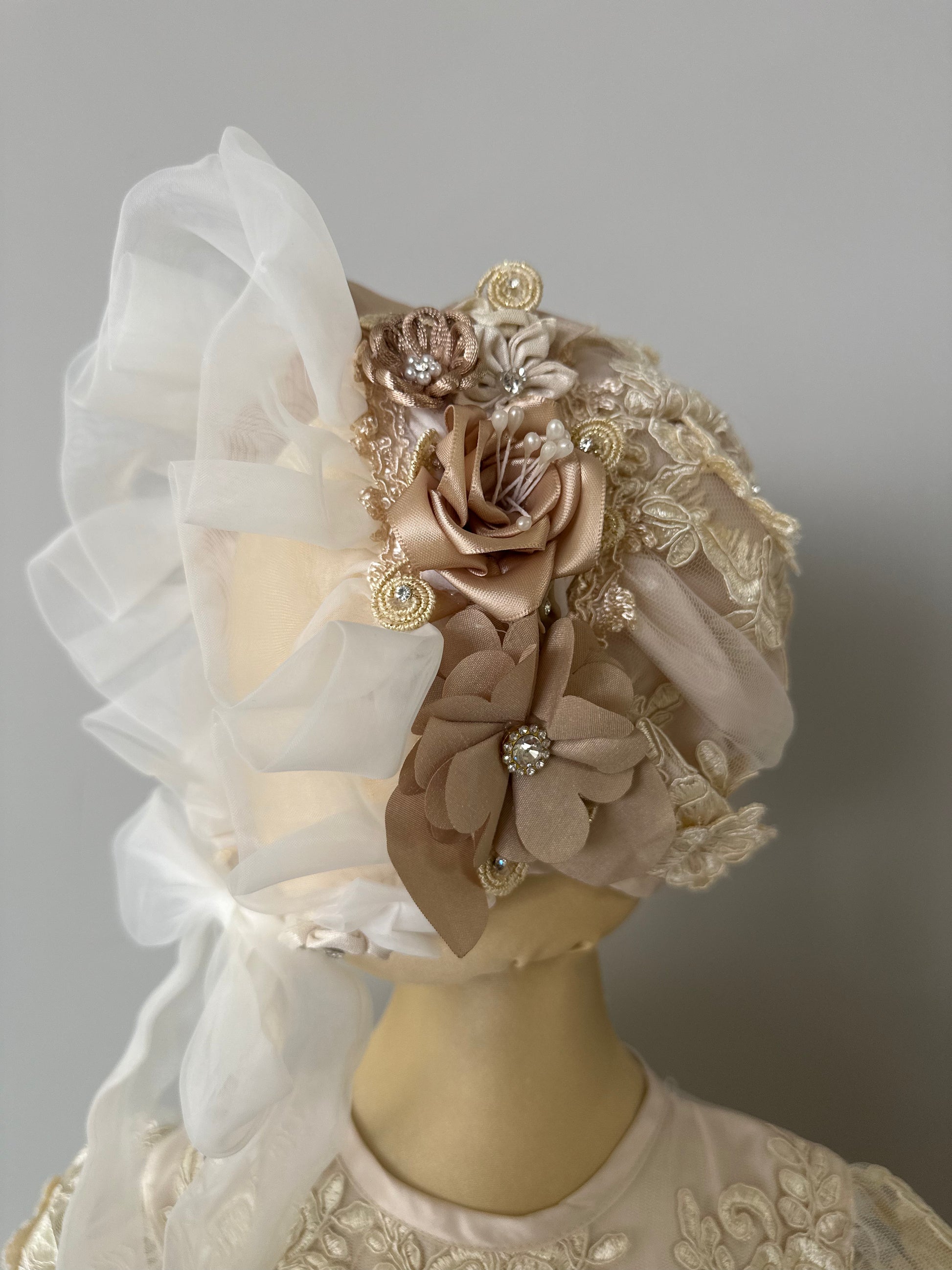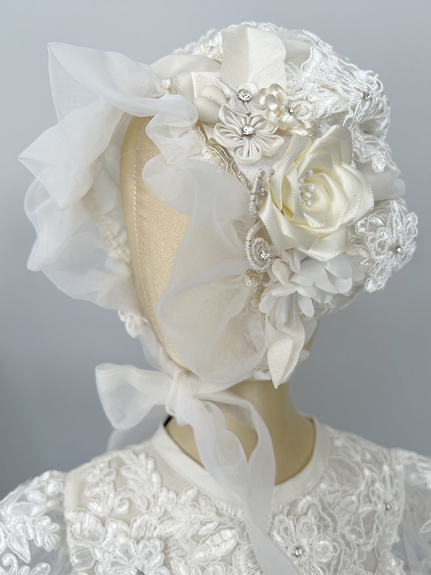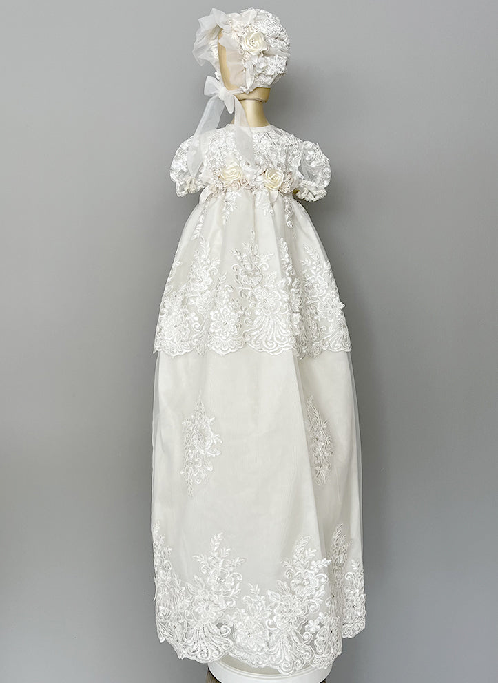 Clásico ropón de bautizo de una sola pieza, elaborado con delicado encaje. Se acompaña de un gorrito a juego.