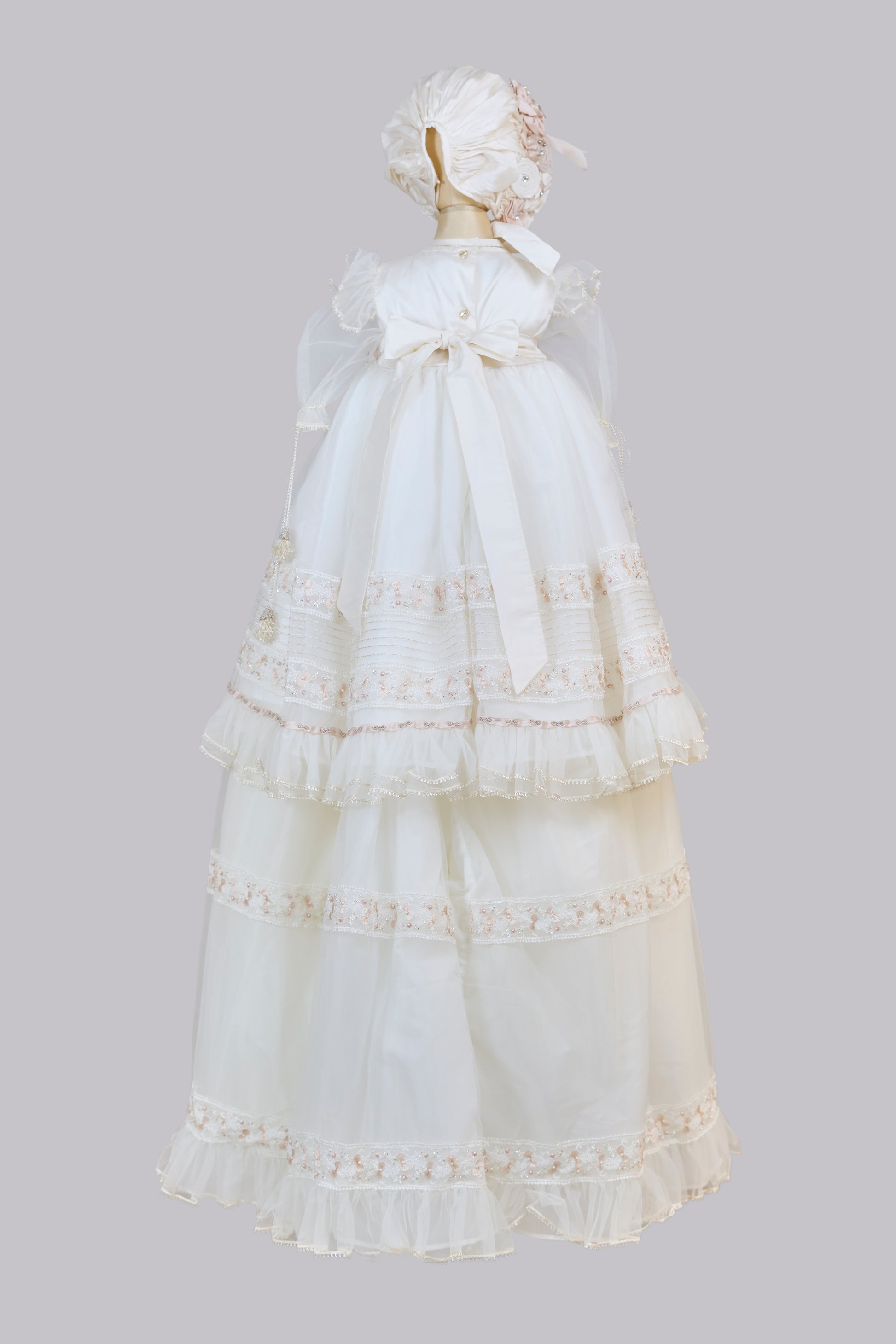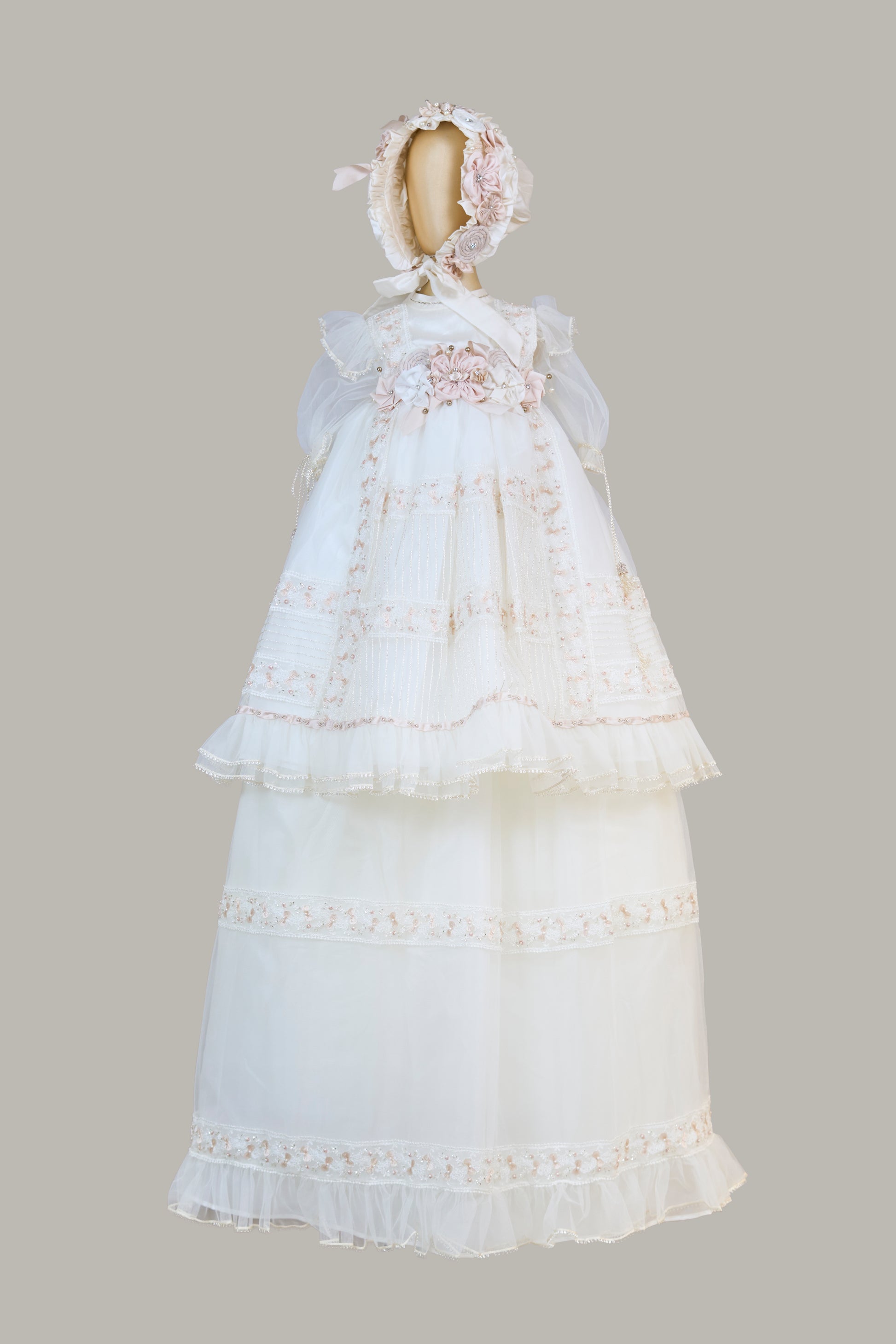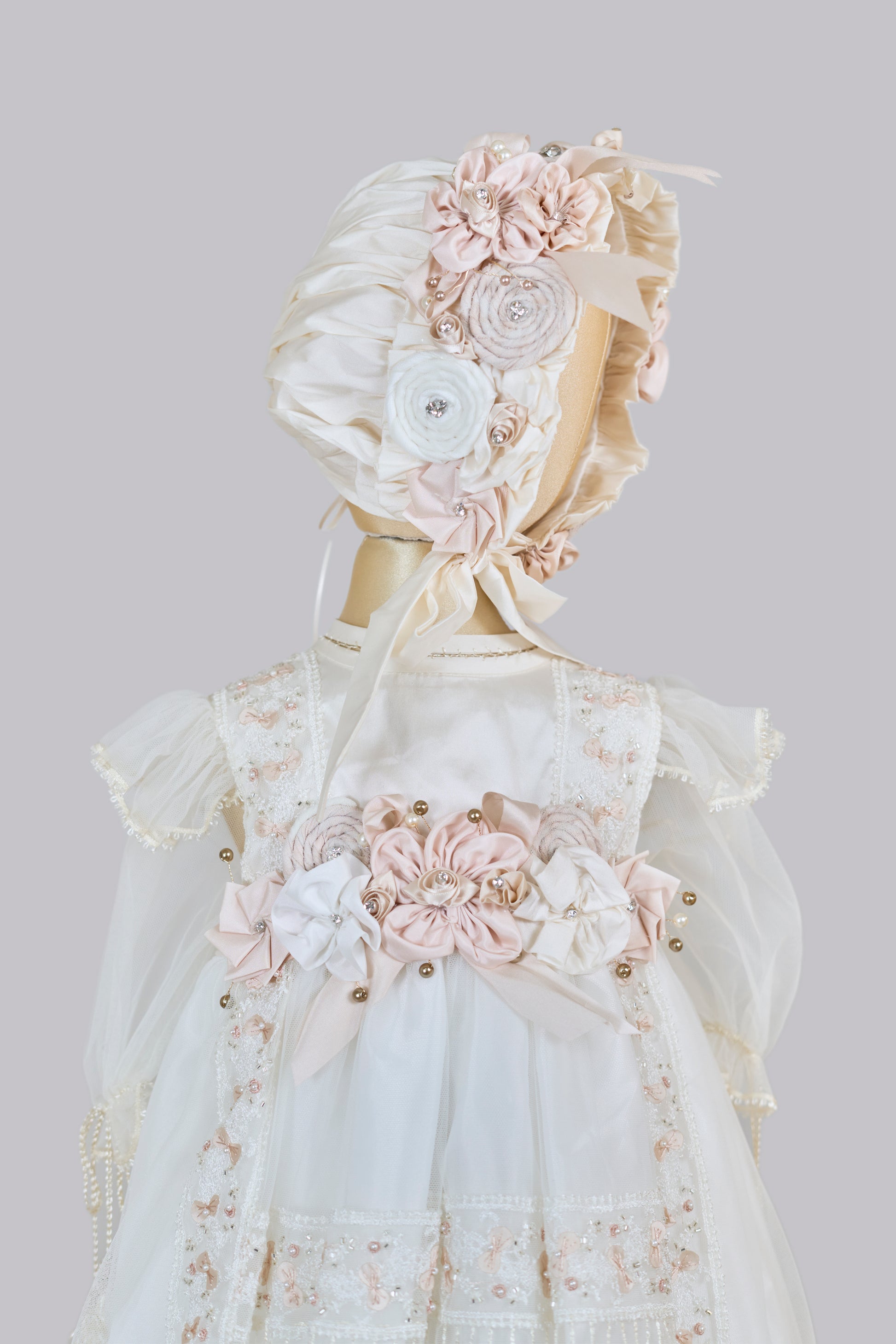 Ropón de bautizo para niña, artesanal y desmontable, confeccionado en tela sedalina con un delicado bordado artesanal. Incluye un lindo gorrito de flores que hace juego con el ropón.