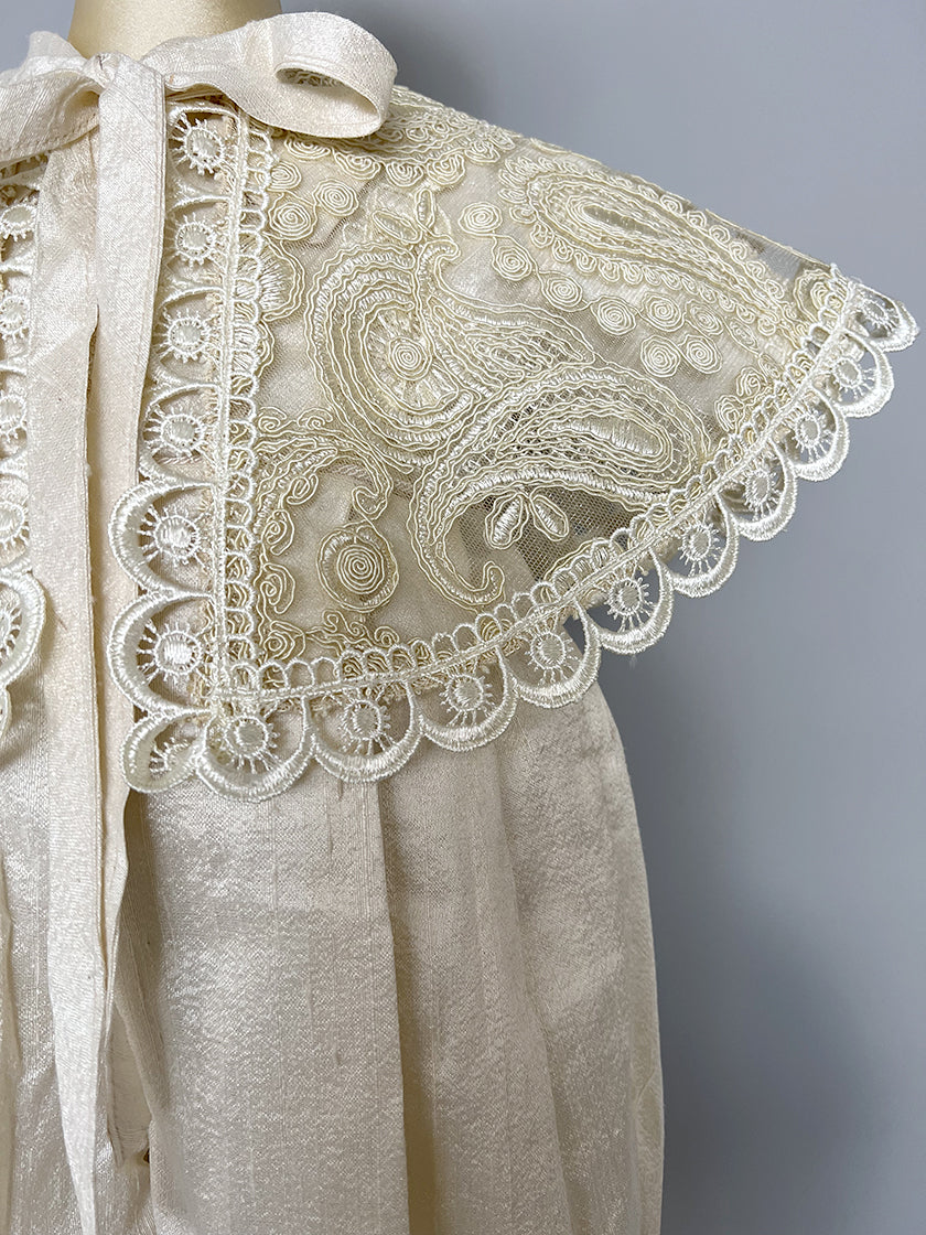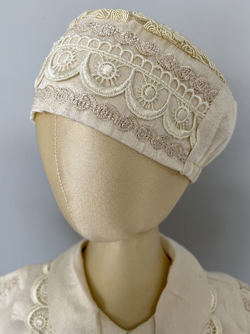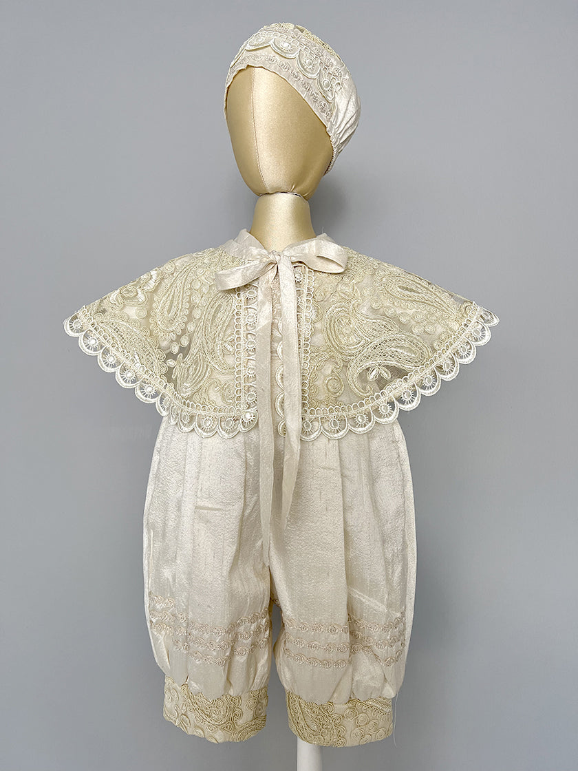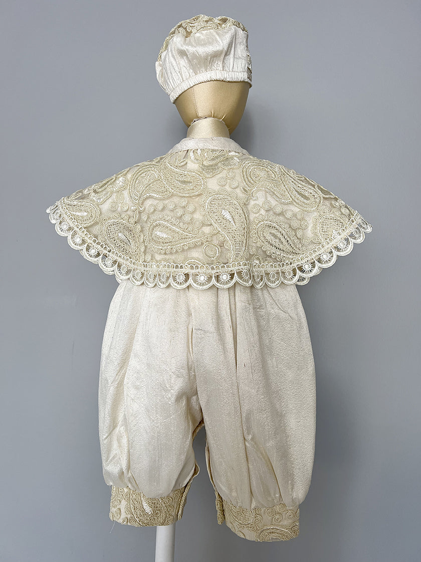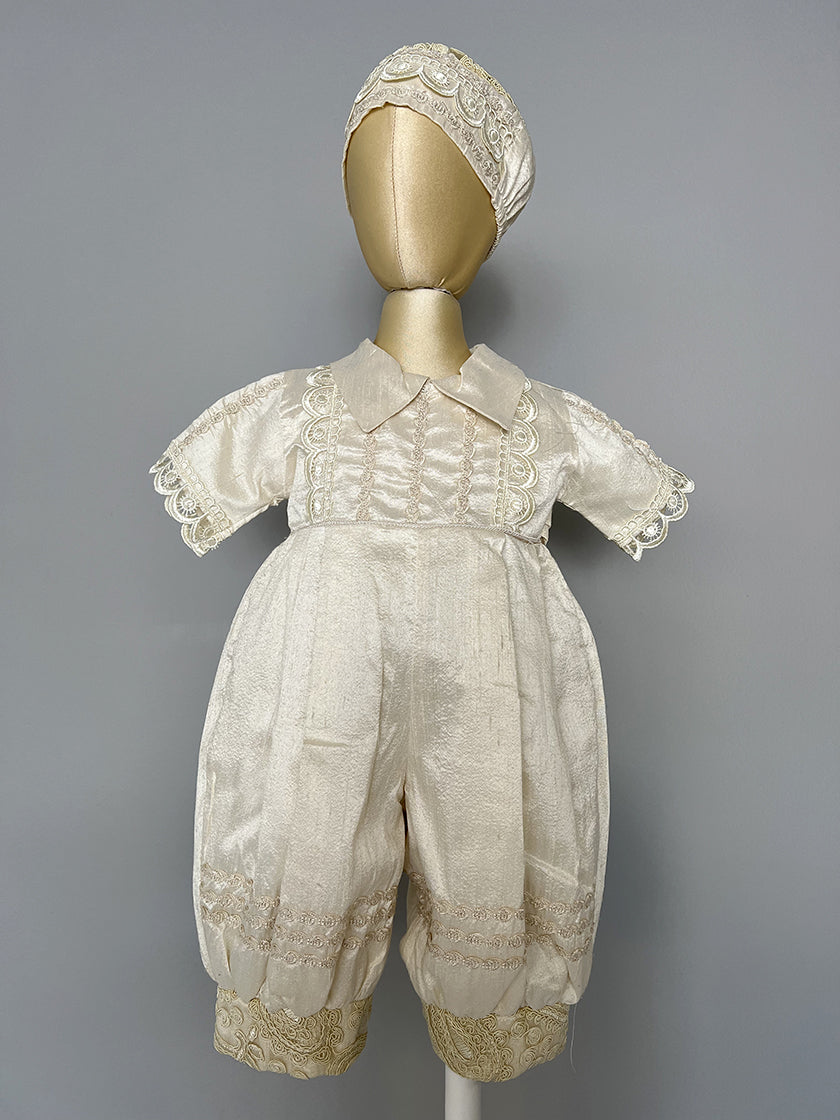 Elegante traje para niño de bautizo estilo bombacho de una pieza confeccionado en shantung de seda en color beige, con aplicaciones de guipure paisley.