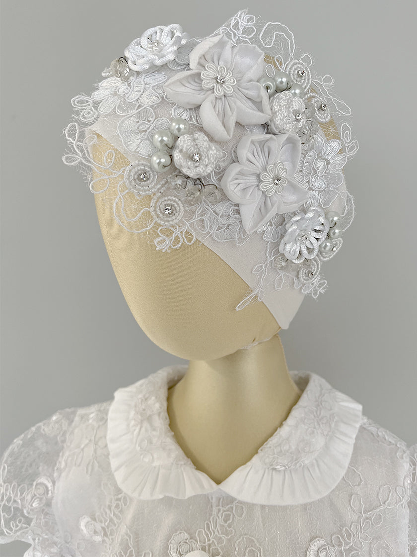 Vestido de niña para bautizo, confeccionado con fino encaje bordado con un diseño floral y un hermoso cuello circular estilo "Peter Pan", con mangas cortas. Incluye una bonita tiara que hace juego con el vestido.