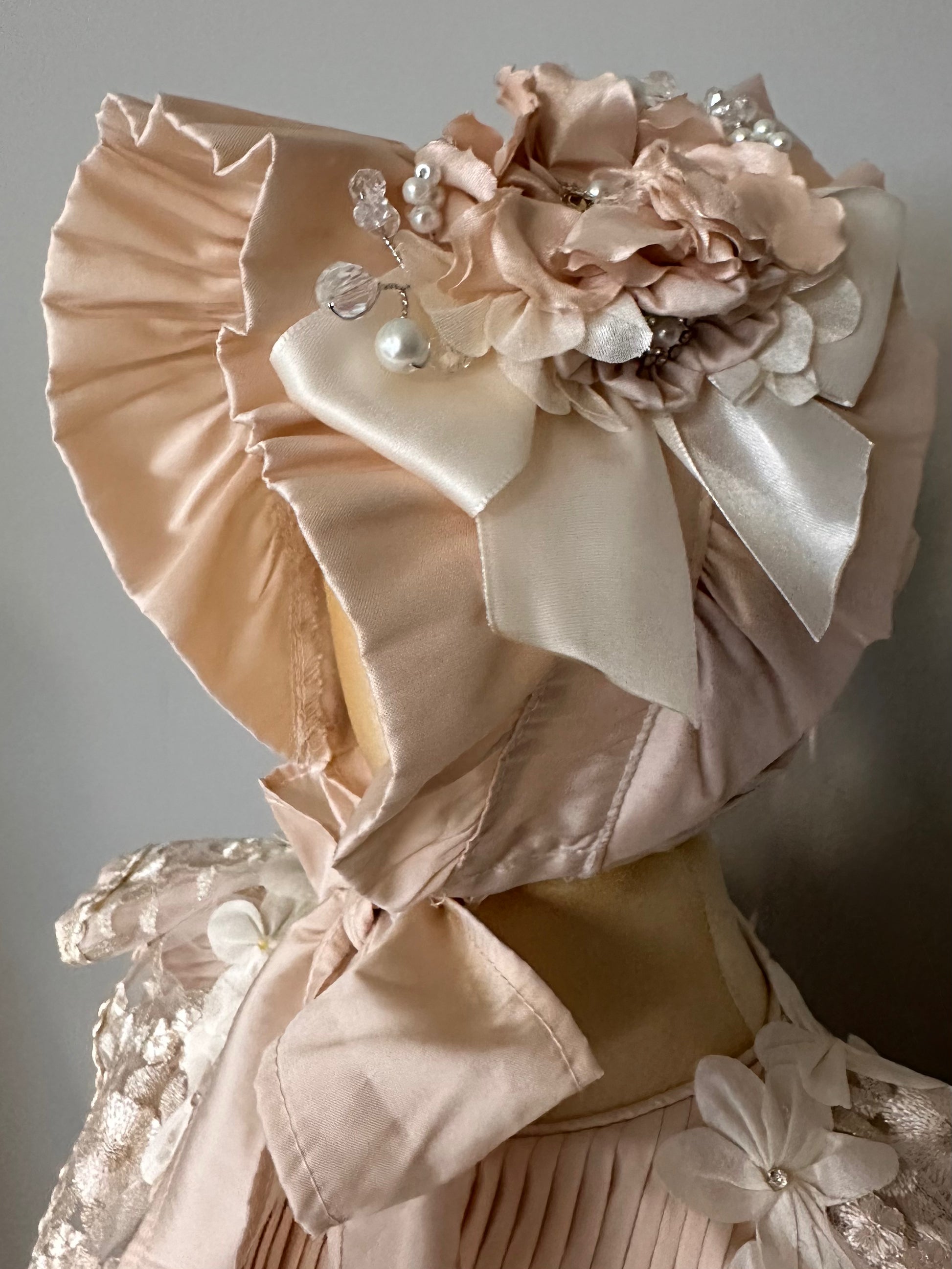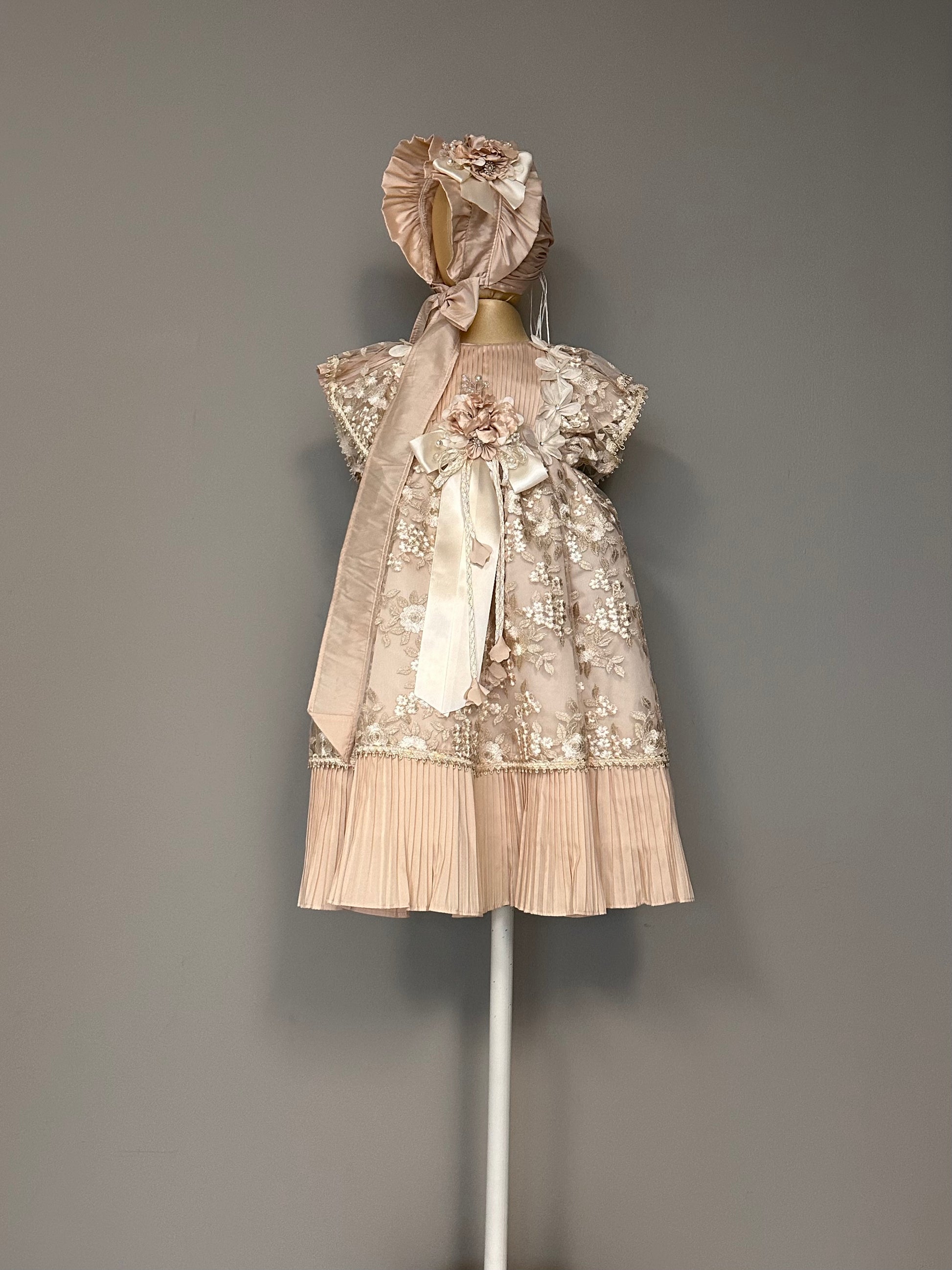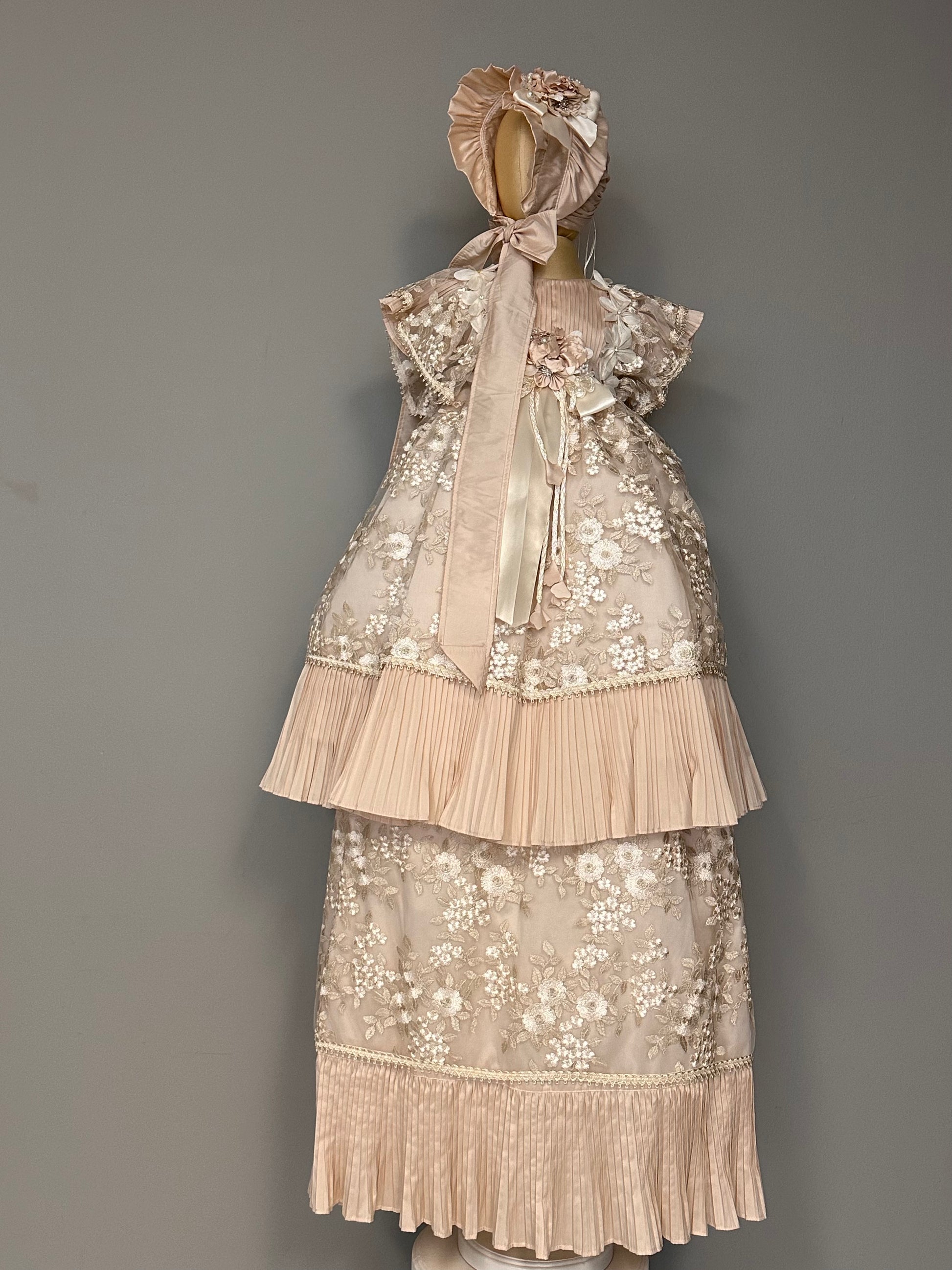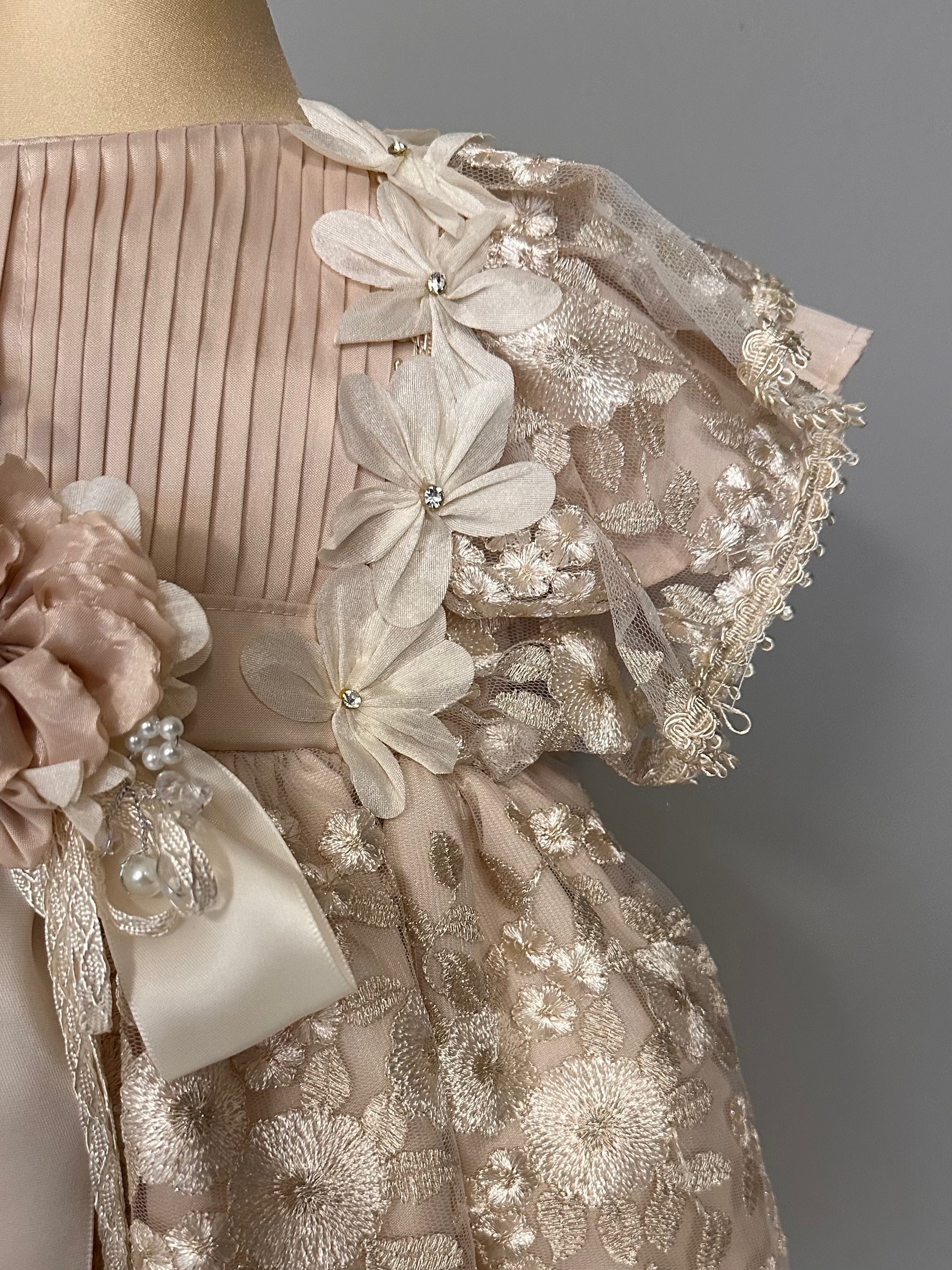 Hermoso ropón de bautizo desmontable para niña, confeccionado con un elegante encaje color hueso, bordado con flores y perlas. Incluye set: sábana, vela, fe y concha.