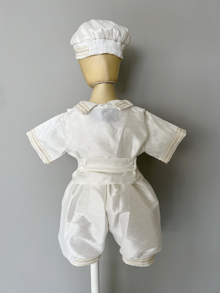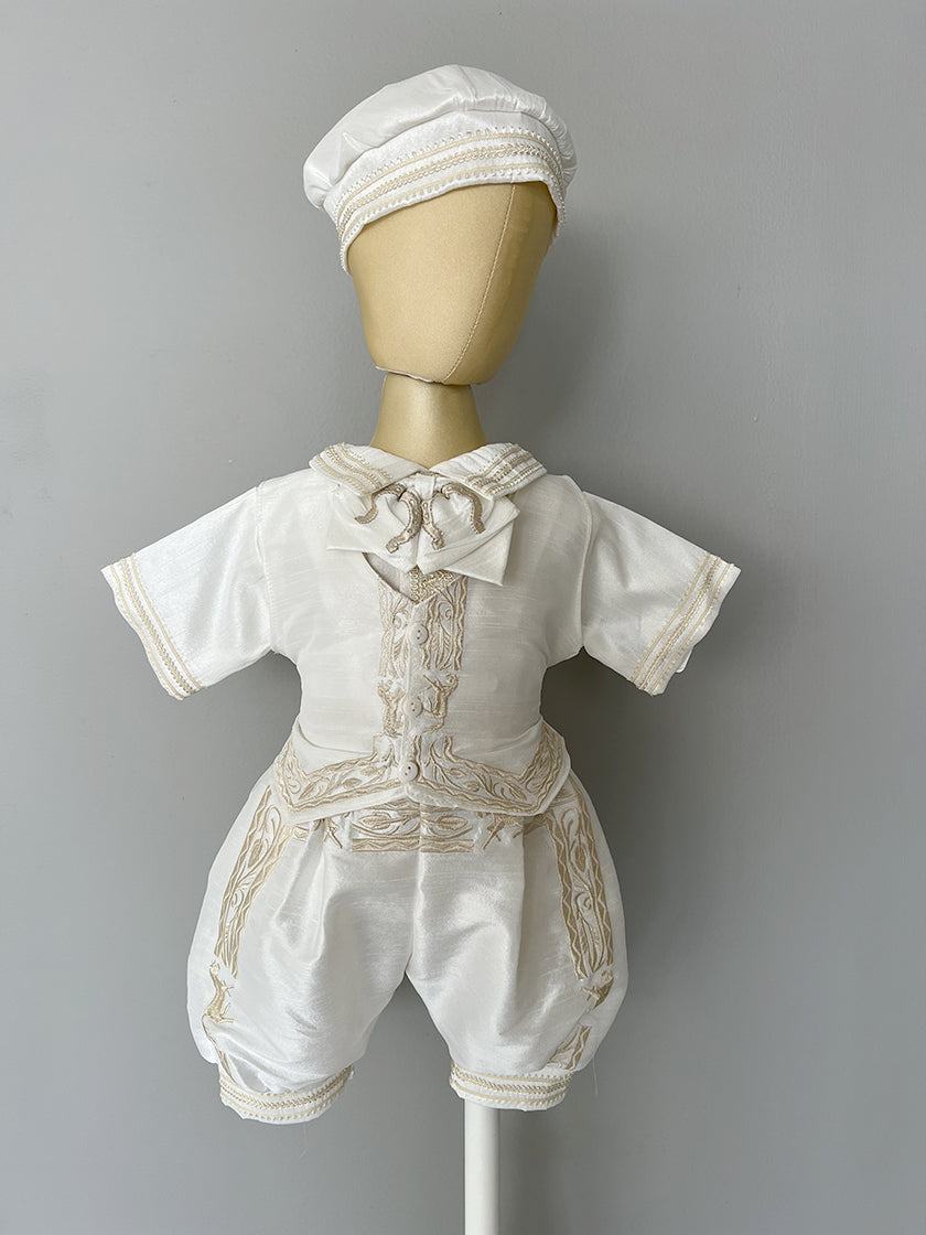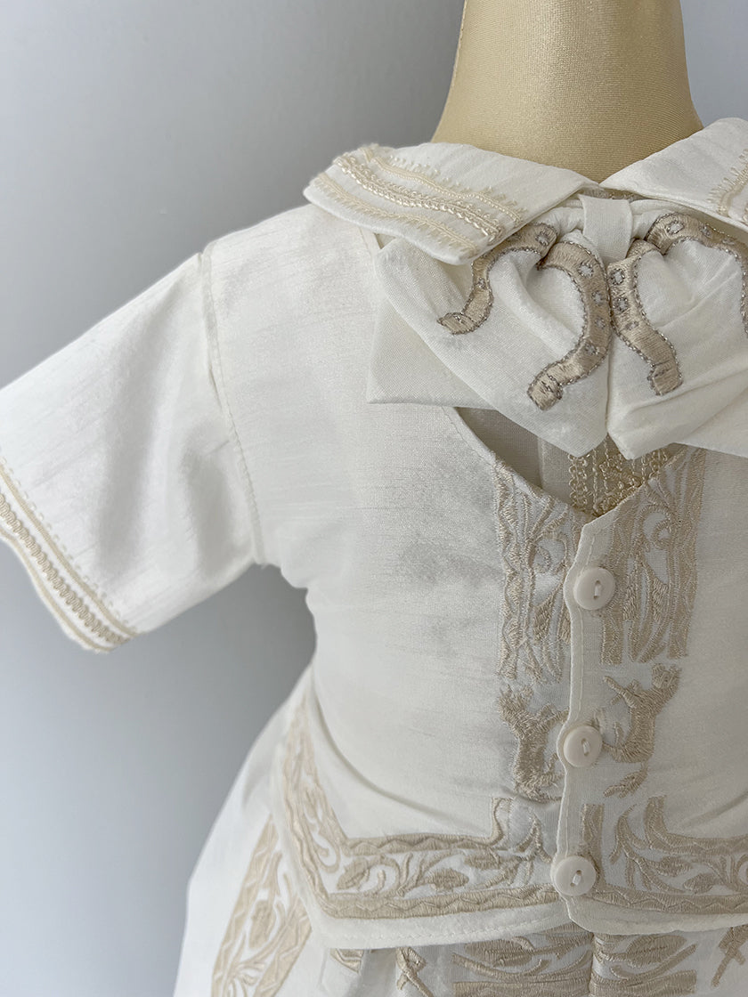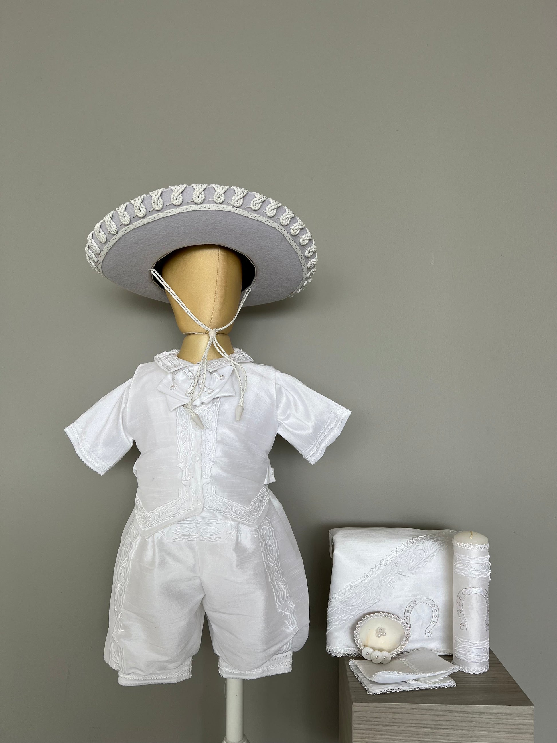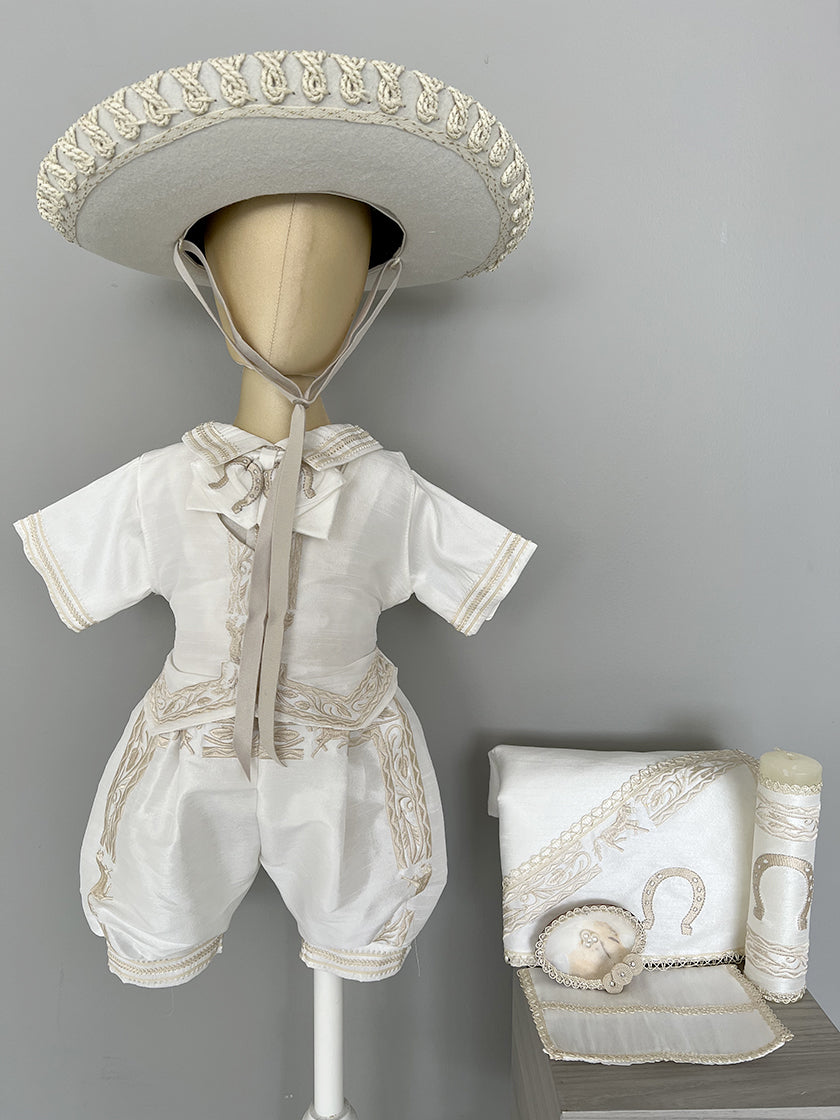 Exclusivo ropón de charro para niño, confeccionado artesanalmente en poli shantung, acompañado de un sombrero, camisa, bombacho, chaleco y moño. Incluye set de bautizo (sábana, vela, fe y concha).