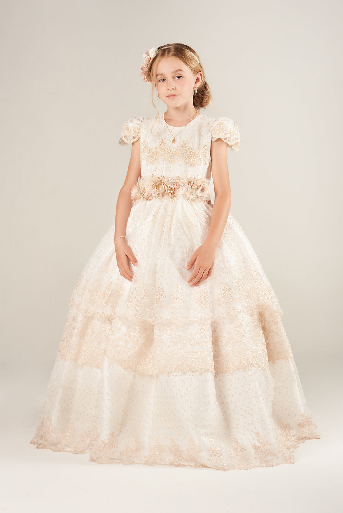 Dividido en capas, la primera está confeccionada en tul ligeramente bordado con diseños circulares. Las mangas son de encaje bordado con flores en tono beige. El talle lleva un fajo elaborado con diferentes tipos de flores hechas a mano.