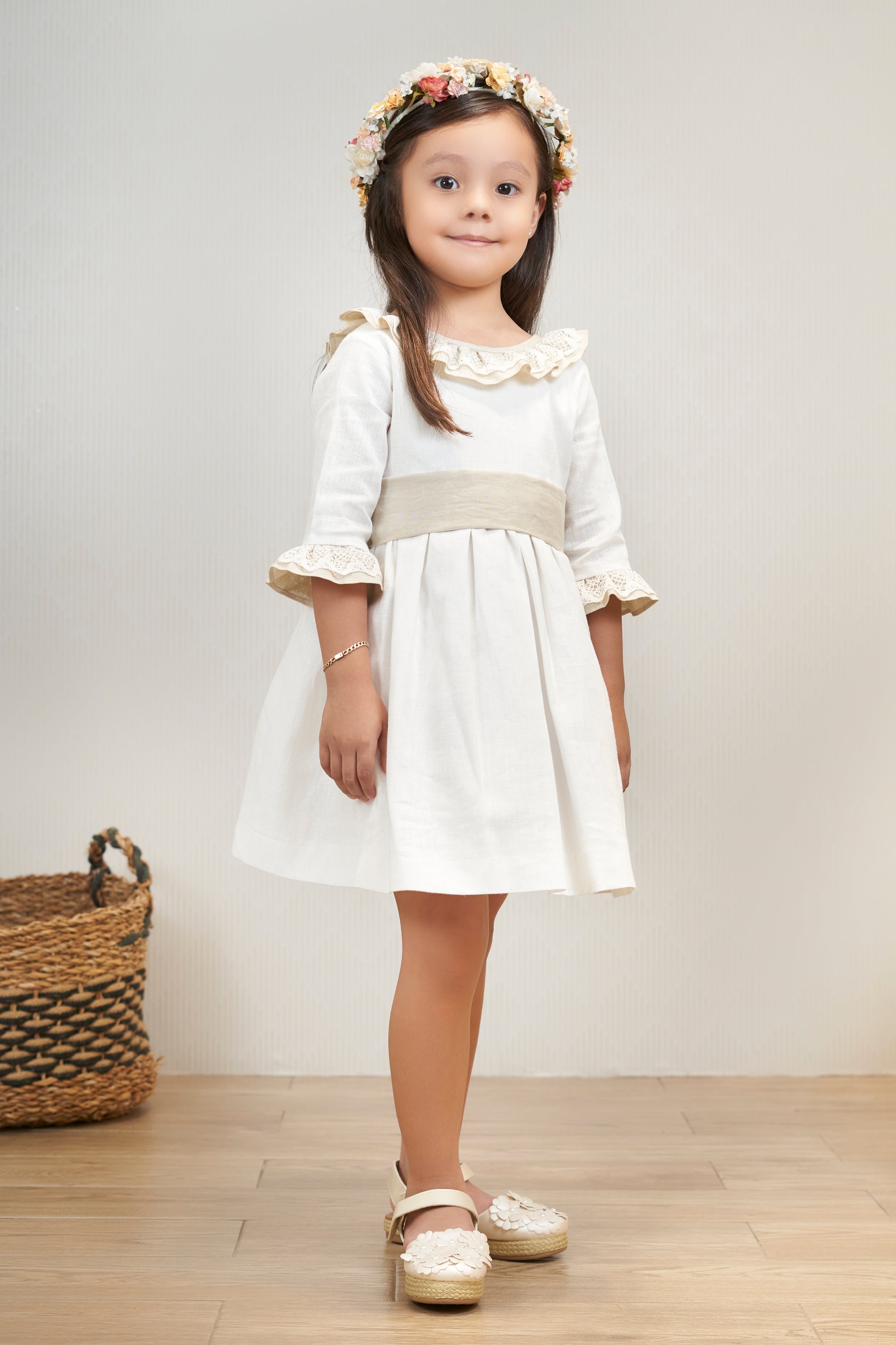 Vestido estilo español confeccionado en lino con detalles de guipuré en manga y cuello.